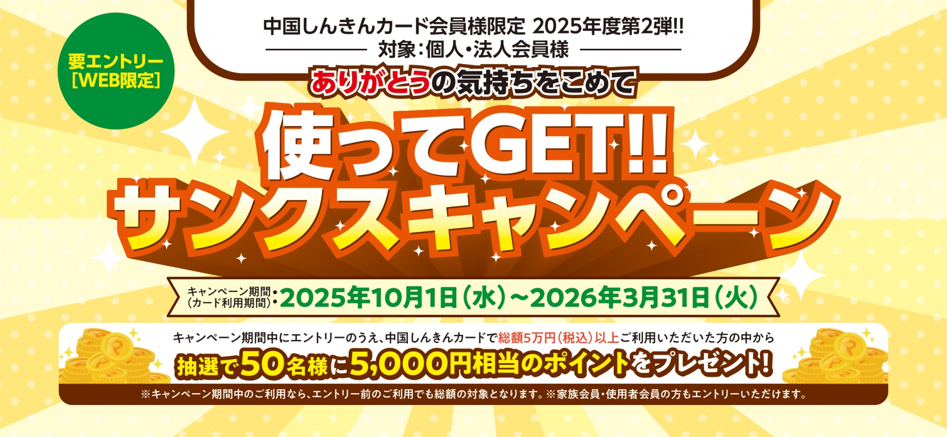応募資格 | キャンペーン期間中に中国しんきんカードで合計50,000円(税込)以上ご利用いただくと、抽選で50名様に 5,000円相当のポイントが当たります! |